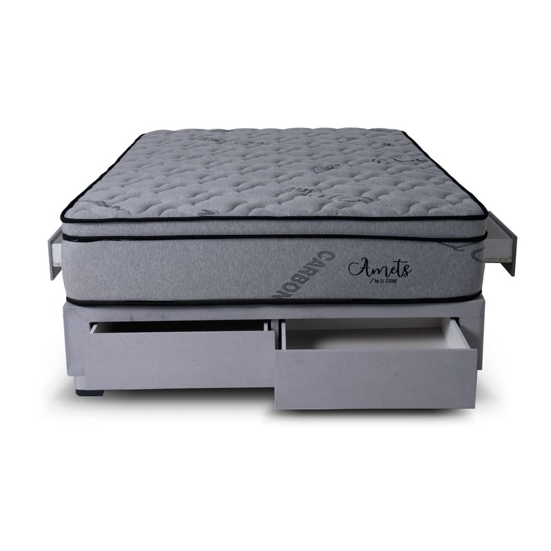 Une diseño refinado, equilibrio entre confort y resistencia, y descanso confiable con Cama Amets. La tarima de madera selecta, tratada y secada al horno aporta elegancia y resistencia al ambiente. El colchón, con sistema de resortes Bonell, garantiza un soporte firme y uniforme, acompañado de espumas de poliuretano que ofrecen confort estable. Su exclusivo tapiz con hilo de carbón contribuye a la frescura y bienestar durante el descanso. De uso one side, pensado para practicidad y larga duración, brinda una sensación de descanso firme. Todo respaldo con una garantía confiable de 10 años y 1 año en la tarima.