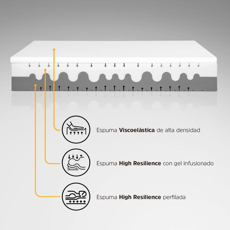 La espuma High Resilience con Gel infusionado equilibra firmeza, soporte y frescura, manteniendo una temperatura ideal toda la noche. Tapizado en tela Tencel, una fibra natural obtenida de la pulpa de la madera, reincorpora por su suavidad sedosa, alta tranquilidad y capacidad de absorción de humedad. Tencel mantiene el colchón fresco, higiénico y libre de bacterias, cuidando tu piel y favoreciendo un entorno de descanso m{as saldable y ecológico. Respaldo con 10 años de garantía.