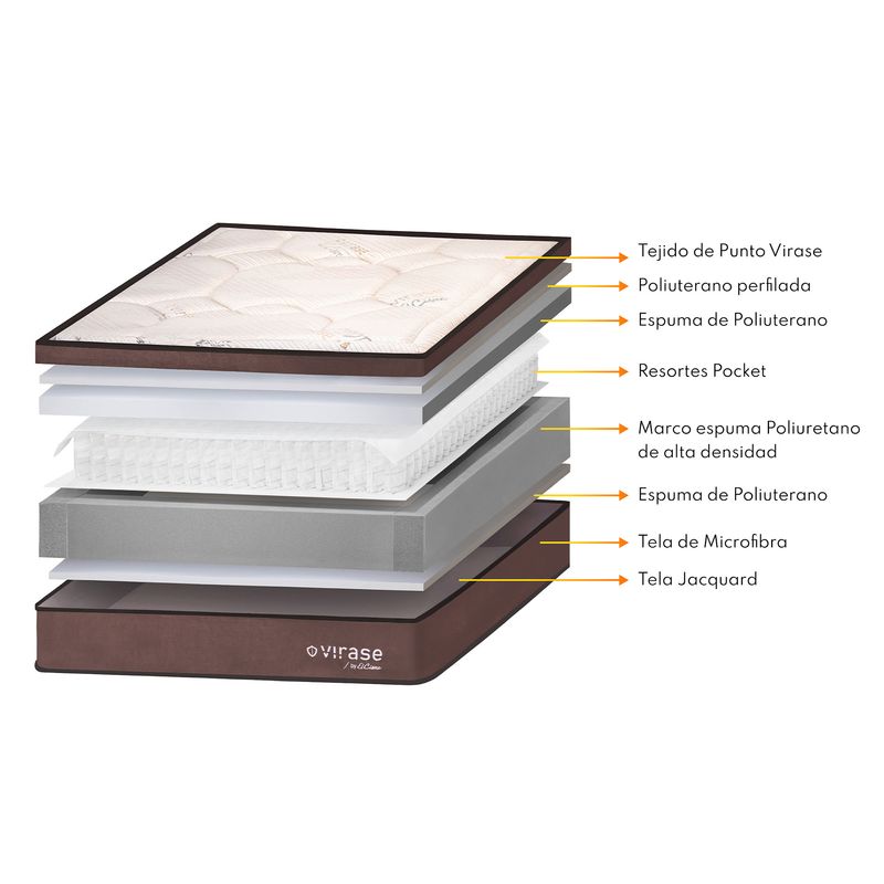 Dormitorio Virase une estilo, innovación y máximo bienestar en cada detalle, pensando para quienes buscan protección avanzada, elegancia y un confort superior noche tras noche. La tarima, elaborada en madera selecta tratada y secada al horno, garantiza solidez, elegancia y durabilidad. El Colchón incorpora un tapiz en tejido de punto Virase con tratamiento antiviral, desarrollado para brindar un descanso más seguro, higiénico y protegido. Su sistema de resortes pocket independientes se adapta al cuerpo y reduce la sensación de movimiento, permitiendo un sueño continuo y sin interrupciones. Las espumas de poliuretano de alta calidad, junto con los acolchados de espumas perfiladas, ofrece una sensación de descanso suave y envolvente, propia de un confort premium. Disfruta de la seguridad de una garantía de 10 años en el colchón y la confianza de 1 año para el dormitorio, para un descanso respaldado de inicio a fin.